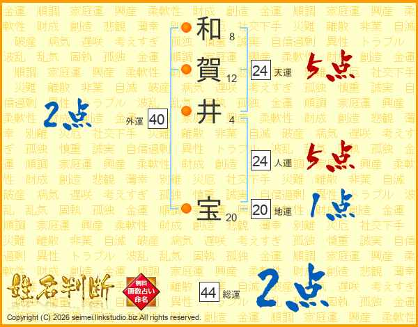 生活面を象徴する運勢です。外部から受ける影響力を表し、結婚運、家庭運や職場、環境への順応性を表します。総運から人運を引いた画数。姓や名が1文字の場合を除く。