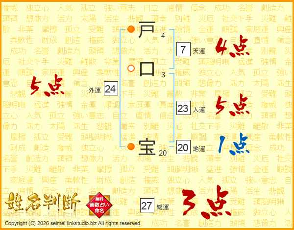 家系が持つ宿命的な運勢を表します。祖先から受け継いだ苗字ですので自分の力が及びません。家柄を象徴します。苗字の合計画数。