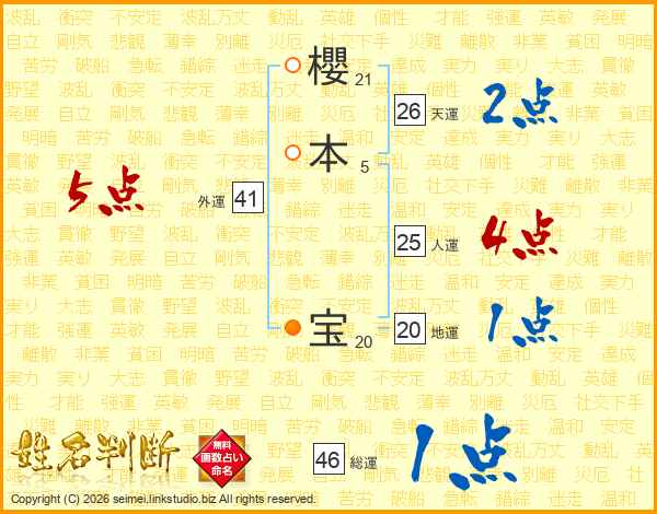 生活面を象徴する運勢です。外部から受ける影響力を表し、結婚運、家庭運や職場、環境への順応性を表します。総運から人運を引いた画数。姓や名が1文字の場合を除く。