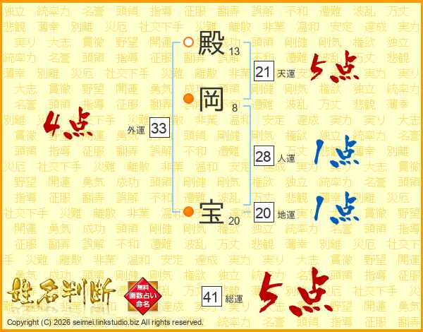 殿岡宝さんの外運は33画の4点!