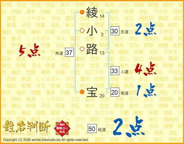 綾(14画)小(3画)路(13画) 宝(20画)