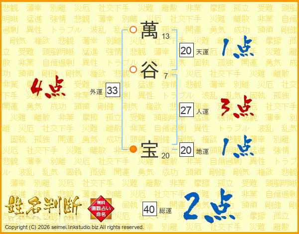 萬(13画)谷(7画) 宝(20画)