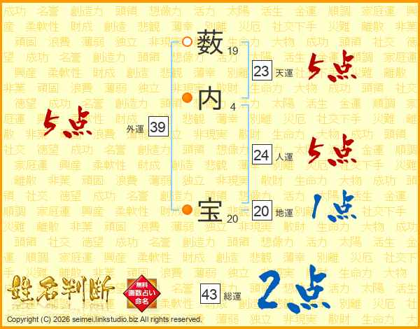 生活面を象徴する運勢です。外部から受ける影響力を表し、結婚運、家庭運や職場、環境への順応性を表します。総運から人運を引いた画数。姓や名が1文字の場合を除く。