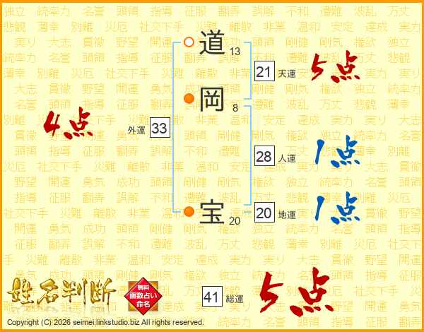 道岡宝さんの総運は41画の5点!