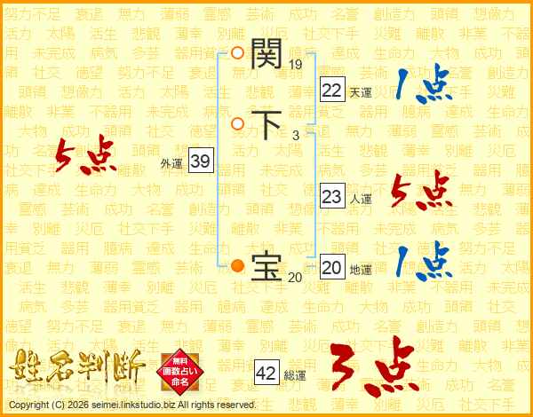 生活面を象徴する運勢です。外部から受ける影響力を表し、結婚運、家庭運や職場、環境への順応性を表します。総運から人運を引いた画数。姓や名が1文字の場合を除く。