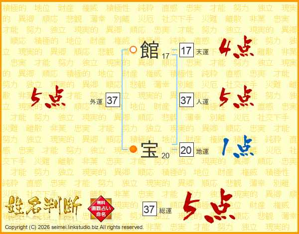 生活面を象徴する運勢です。外部から受ける影響力を表し、結婚運、家庭運や職場、環境への順応性を表します。総運から人運を引いた画数。姓や名が1文字の場合を除く。