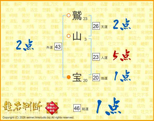 生活面を象徴する運勢です。外部から受ける影響力を表し、結婚運、家庭運や職場、環境への順応性を表します。総運から人運を引いた画数。姓や名が1文字の場合を除く。