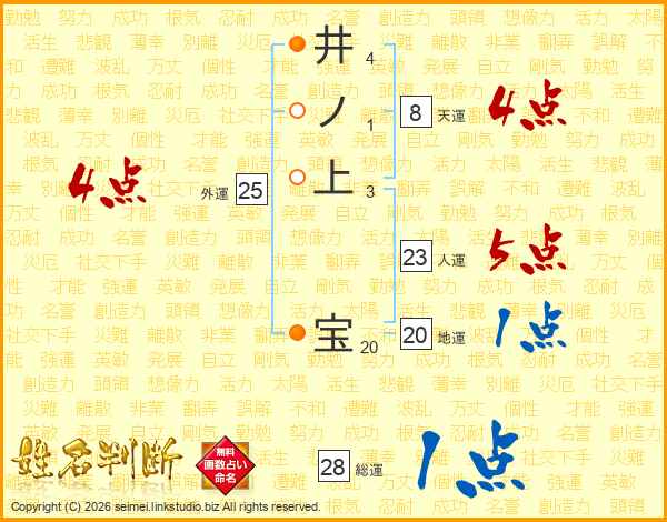 井(4画)ノ(1画)上(3画) 宝(20画)