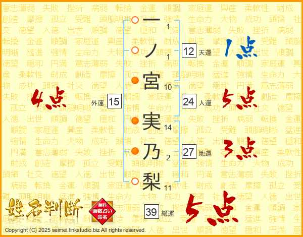 一(1画)ノ(1画)宮(10画) 実(14画)乃(2画)梨(11画)