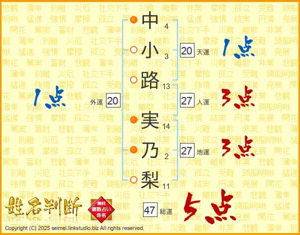 中(4画)小(3画)路(13画) 実(14画)乃(2画)梨(11画)