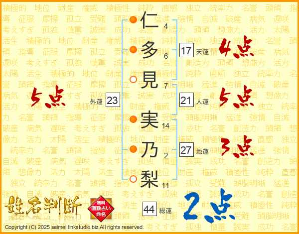 仁(4画)多(6画)見(7画) 実(14画)乃(2画)梨(11画)