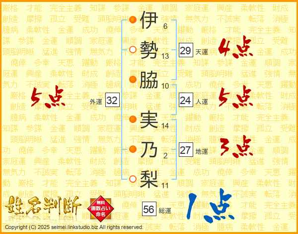 伊(6画)勢(13画)脇(10画) 実(14画)乃(2画)梨(11画)