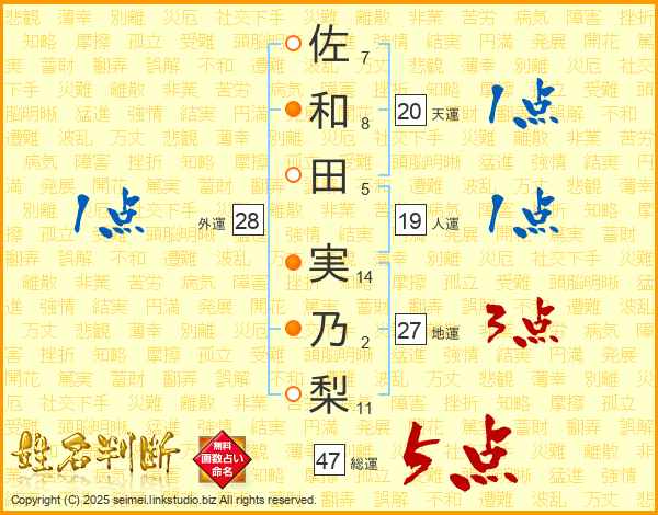 佐(7画)和(8画)田(5画) 実(14画)乃(2画)梨(11画)