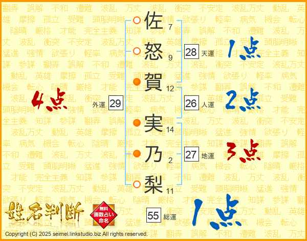 佐(7画)怒(9画)賀(12画) 実(14画)乃(2画)梨(11画)