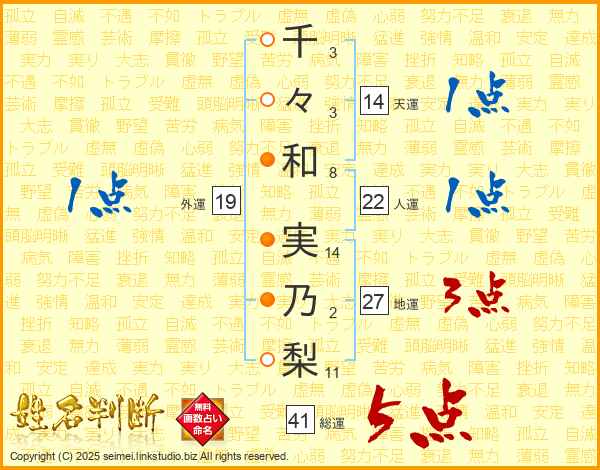 千(3画)々(3画)和(8画) 実(14画)乃(2画)梨(11画)