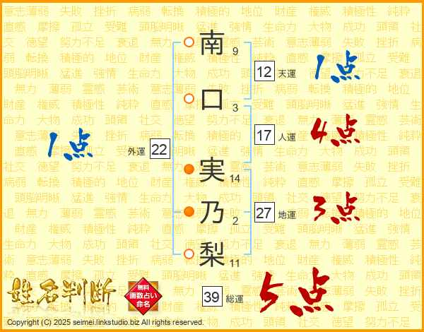 南(9画)口(3画) 実(14画)乃(2画)梨(11画)