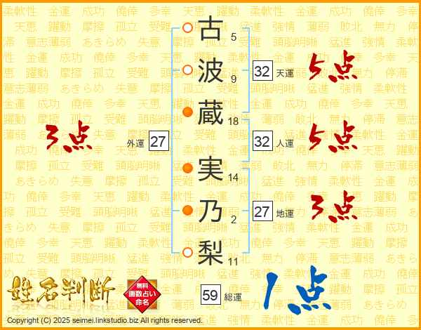 古(5画)波(9画)蔵(18画) 実(14画)乃(2画)梨(11画)
