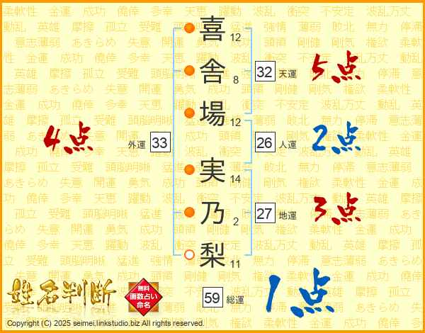 喜(12画)舎(8画)場(12画) 実(14画)乃(2画)梨(11画)