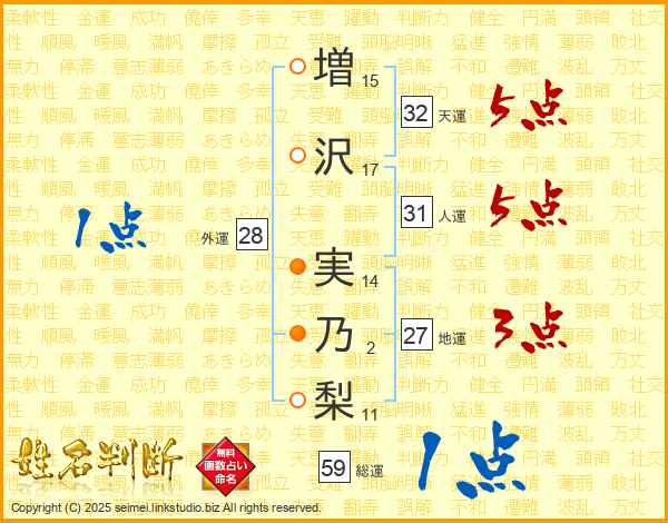 増(15画)沢(17画) 実(14画)乃(2画)梨(11画)