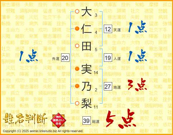 大(3画)仁(4画)田(5画) 実(14画)乃(2画)梨(11画)
