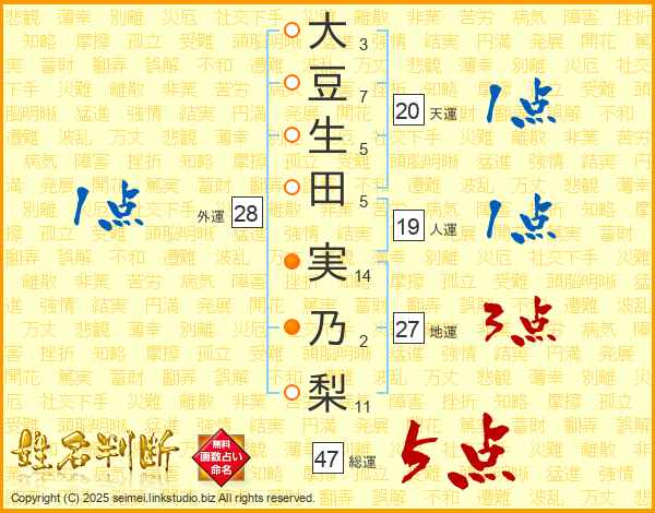 大豆生田実乃梨さんの総運は47画の5点!