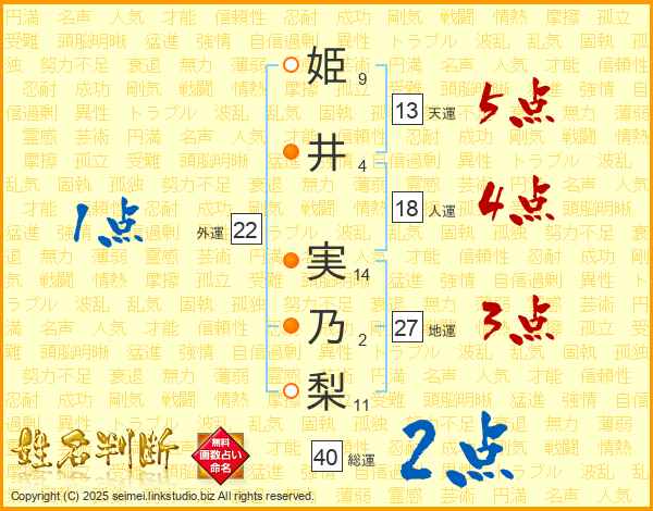 姫(9画)井(4画) 実(14画)乃(2画)梨(11画)