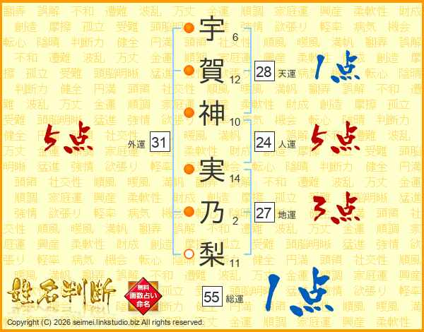 宇(6画)賀(12画)神(10画) 実(14画)乃(2画)梨(11画)