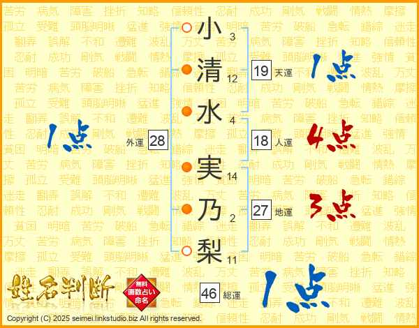 小(3画)清(12画)水(4画) 実(14画)乃(2画)梨(11画)