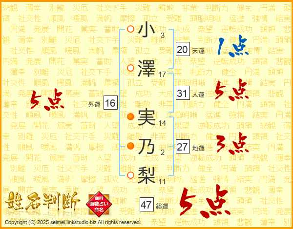小澤実乃梨さんの外運は16画の5点!