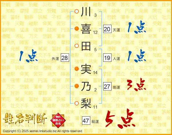 川(3画)喜(12画)田(5画) 実(14画)乃(2画)梨(11画)