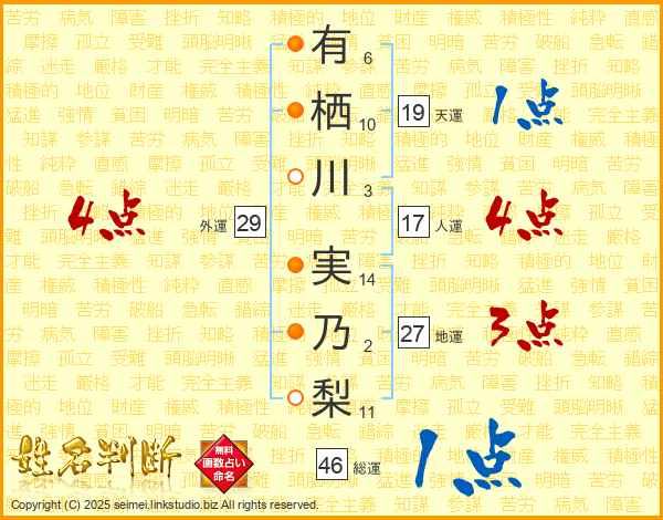有(6画)栖(10画)川(3画) 実(14画)乃(2画)梨(11画)
