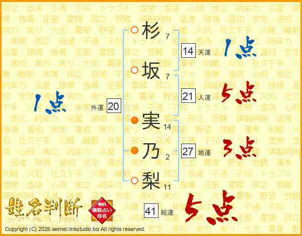 杉(7画)坂(7画) 実(14画)乃(2画)梨(11画)