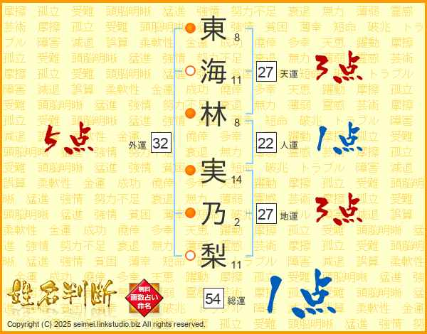 東(8画)海(11画)林(8画) 実(14画)乃(2画)梨(11画)