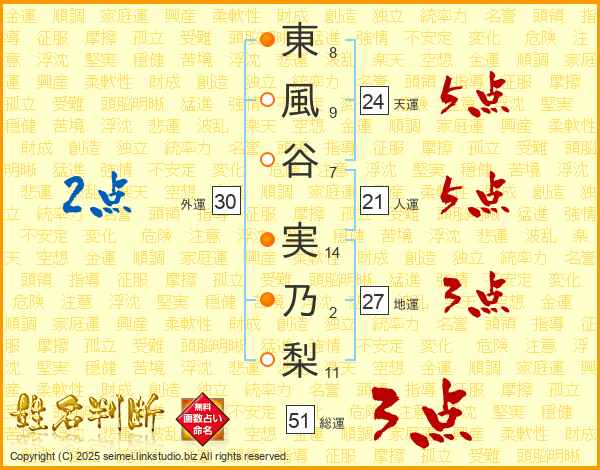 東(8画)風(9画)谷(7画) 実(14画)乃(2画)梨(11画)
