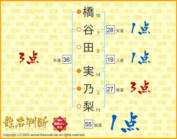 橋(16画)谷(7画)田(5画) 実(14画)乃(2画)梨(11画)