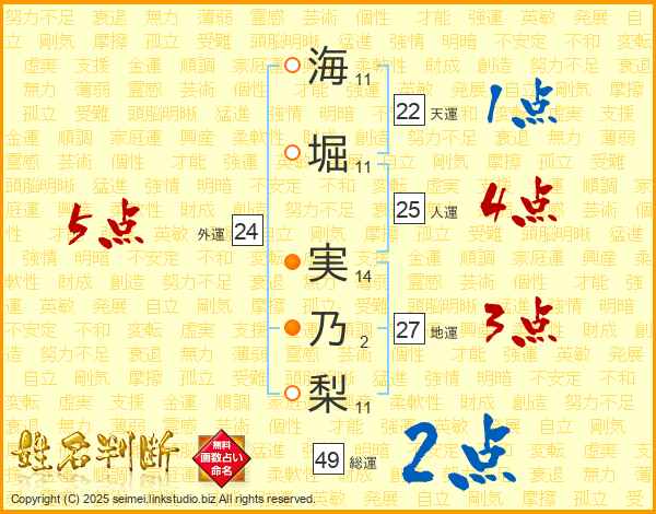 海(11画)堀(11画) 実(14画)乃(2画)梨(11画)