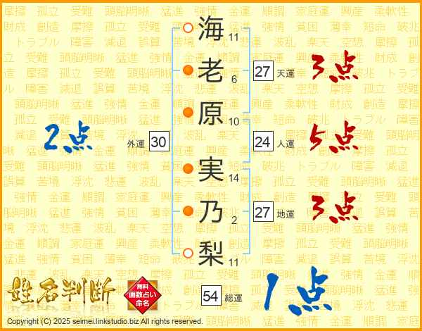 海(11画)老(6画)原(10画) 実(14画)乃(2画)梨(11画)