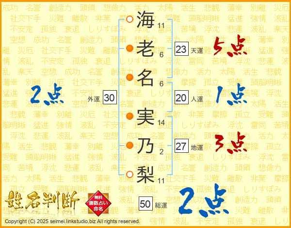 海(11画)老(6画)名(6画) 実(14画)乃(2画)梨(11画)