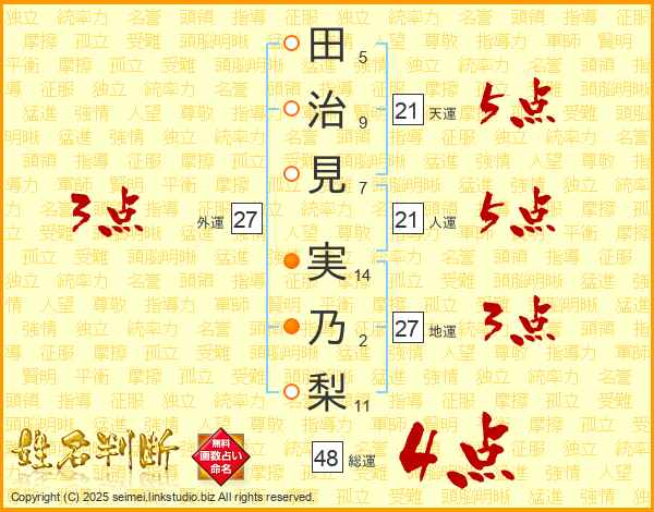 田(5画)治(9画)見(7画) 実(14画)乃(2画)梨(11画)