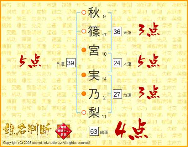 秋(9画)篠(17画)宮(10画) 実(14画)乃(2画)梨(11画)