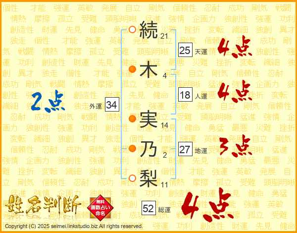 続(21画)木(4画) 実(14画)乃(2画)梨(11画)