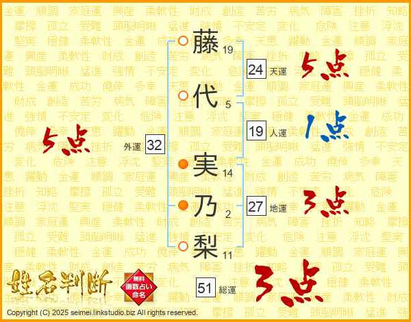 藤(19画)代(5画) 実(14画)乃(2画)梨(11画)
