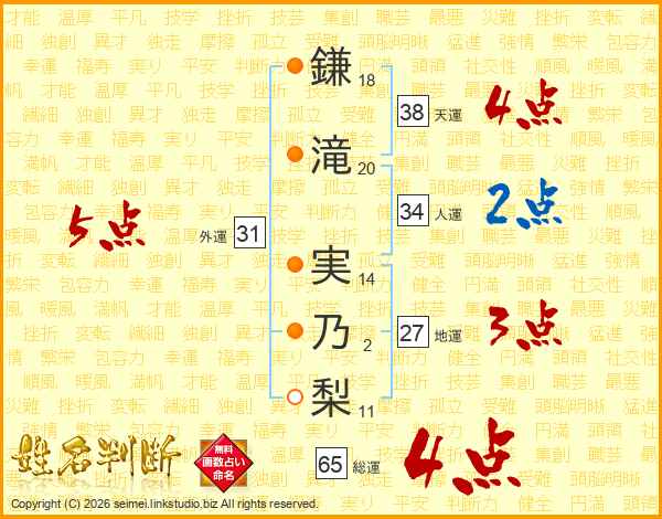 鎌(18画)滝(20画) 実(14画)乃(2画)梨(11画)
