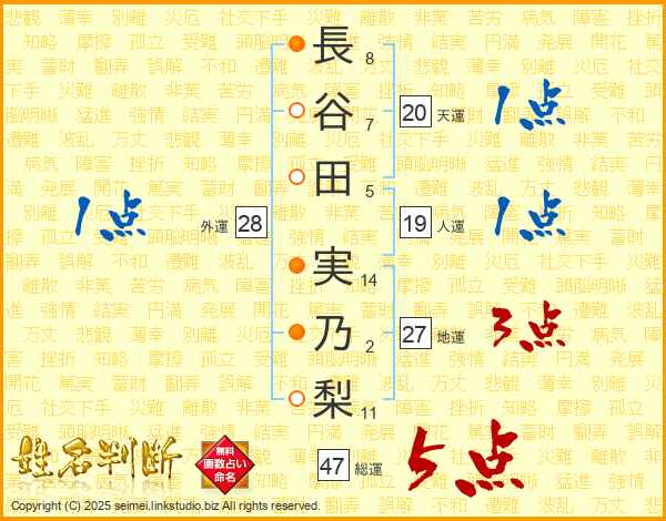 長(8画)谷(7画)田(5画) 実(14画)乃(2画)梨(11画)
