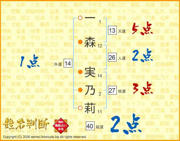 一(1画)森(12画) 実(14画)乃(2画)莉(11画)