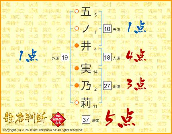 五(5画)ノ(1画)井(4画) 実(14画)乃(2画)莉(11画)