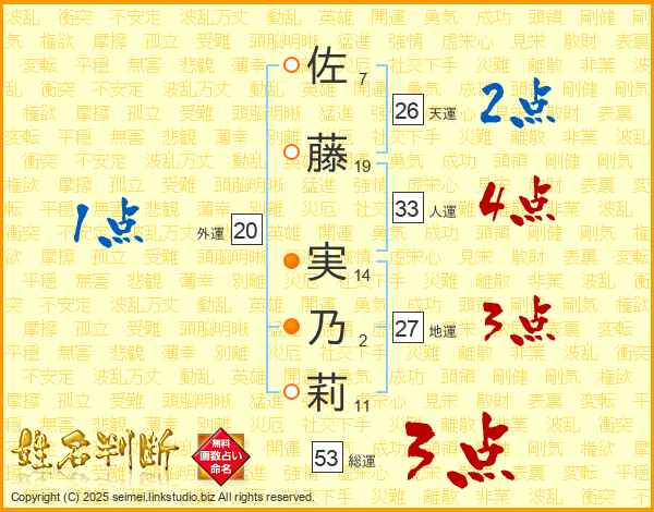 佐(7画)藤(19画) 実(14画)乃(2画)莉(11画)