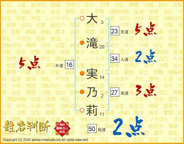 大(3画)滝(20画) 実(14画)乃(2画)莉(11画)