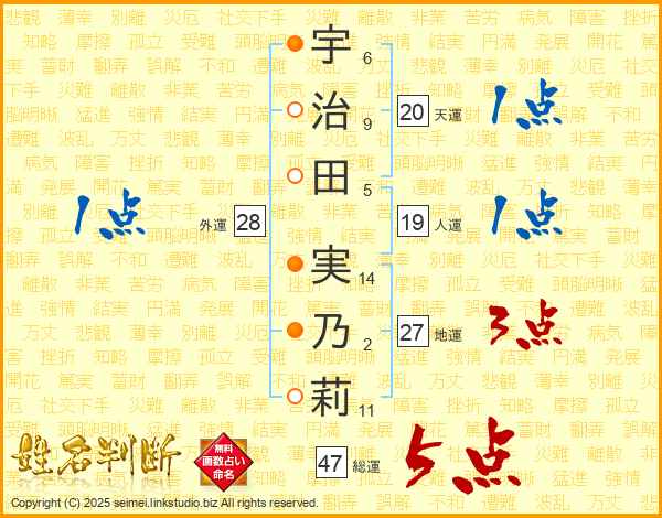 宇(6画)治(9画)田(5画) 実(14画)乃(2画)莉(11画)