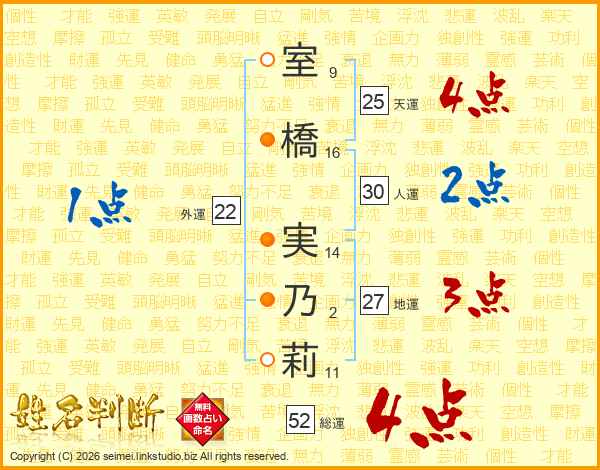 室(9画)橋(16画) 実(14画)乃(2画)莉(11画)